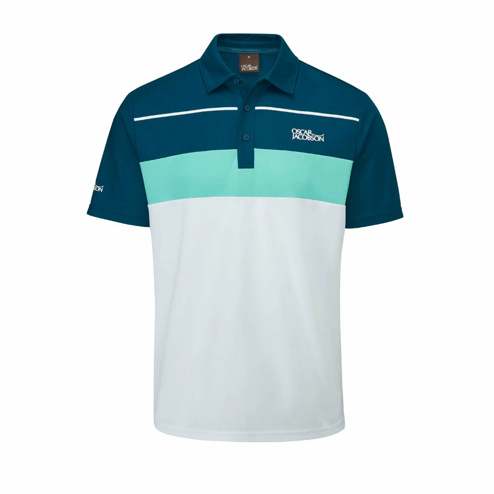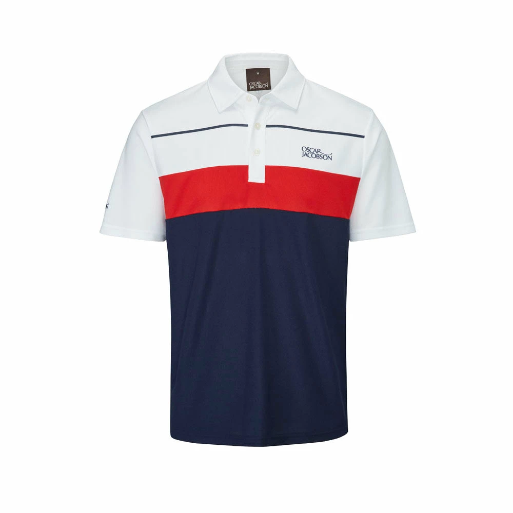 The colour blocked DODMAN polo shirt is a performance polo with strong complementary colours. The durable lightweight four way stretch fabrication offers un-rivalled freedom of movement and exceptional breathability. The established Oscar Jacobson contemporary relaxed fit, soft handle and construction of the bespoke fabric offers ultimate comfort and enhanced playing experience. The self fabric collar and open cuffs, three button placket, contrast chest stripes and side hem vents further enhance the brands ultimate commitment to detail and quality.