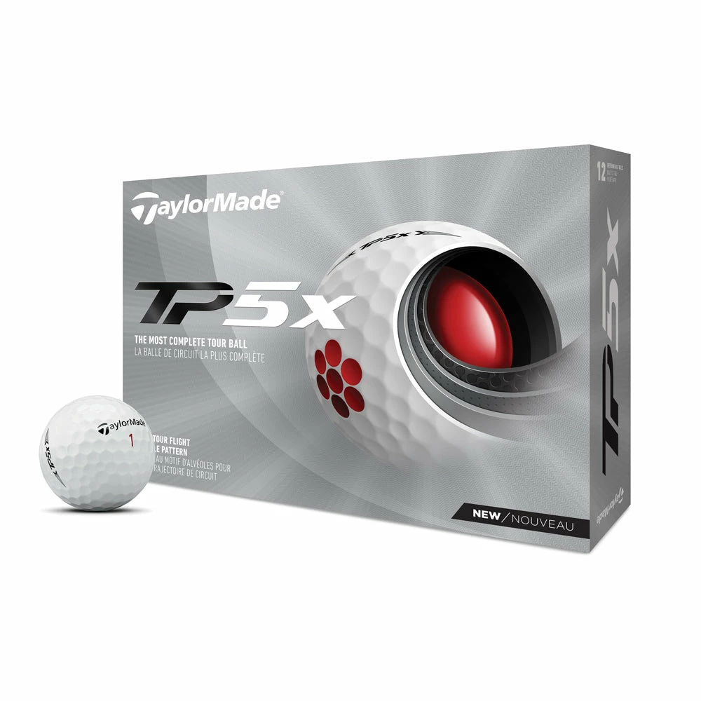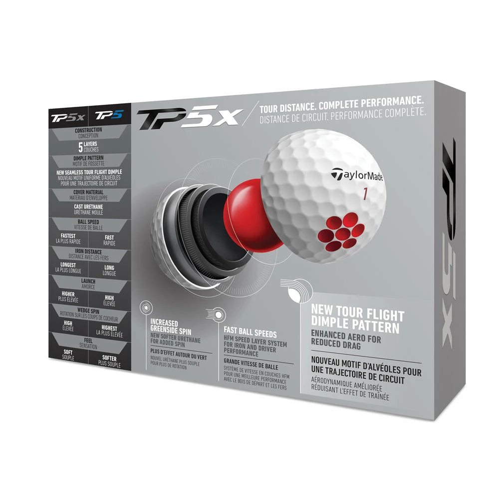 - 5-Layer ConstructionThe key to achieving enhanced speed without negatively affecting spin performance comes from TaylorMade’s proprietary 5-layer ball construction. Including a larger and more reactive Tri-Fast Core that delivers maximum carry and low drag and a Dual-Spin Cover that features an ultra-soft, highly durable cast urethane cover, TP5 offers complete tee-to-green performance without sacrifice. The ultimate result is a ball that promotes a fast launch, maximum carry distances and a steep angle of descent for extra stopping power – especially on long irons.